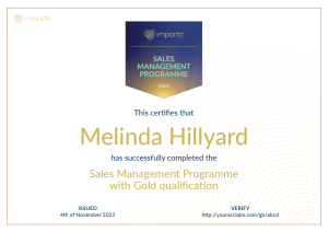 Digital badges are secure, web-enabled credentials containing verified information about professional achievements. Imparta uses digital badges to enable sales professionals to evidence their experience and expertise. The badge can be displayed as part of a badge portfolio or as a link on a CV, featured within an email signature or shared via social media.