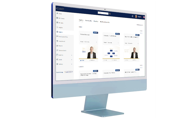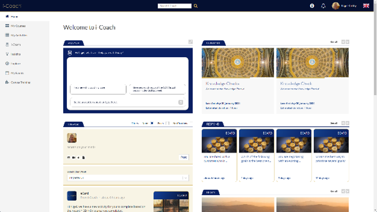 Our homepage serves as a news feed, collaboration hub, and notification center for i-Coach users. It provides easy access to assigned and outstanding courses, tasks, and events, as well as recommended learning journeys based on their competency data. Our Engage wall provides salespeople with a place to share tips and best practices and ask for help and advice from peers, as well as from our AI tool, i-Coach AI®, which is trained in our full IP library and can provide advice, information, and in-depth coaching as required.
