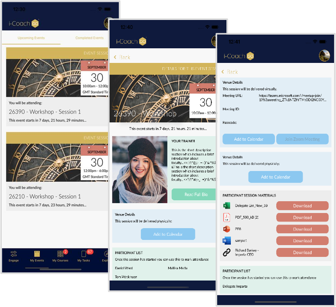 - Learn about who will be training them, including a full bio. Access any materials required for the event.