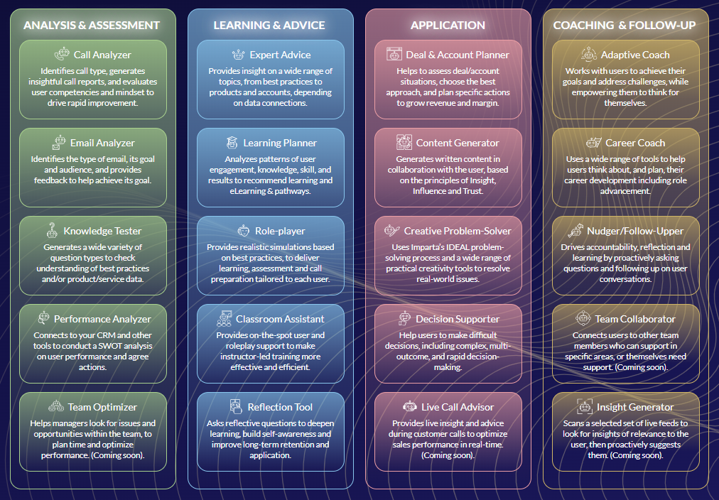 i-Coach®AI is a fully agentic AI system powered by Imparta’s sales expertise and your own data sources to provide personalised, proactive revenue enablement at enterprise scale.