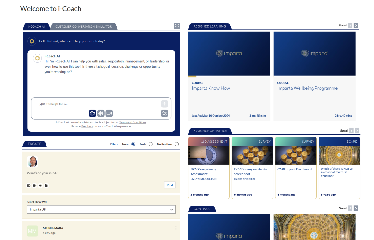 i-Coach® AI is a fully agentic AI system, powered by Imparta’s sales expertise and your own data sources to provide personalised, proactive revenue enablement at enterprise scale.