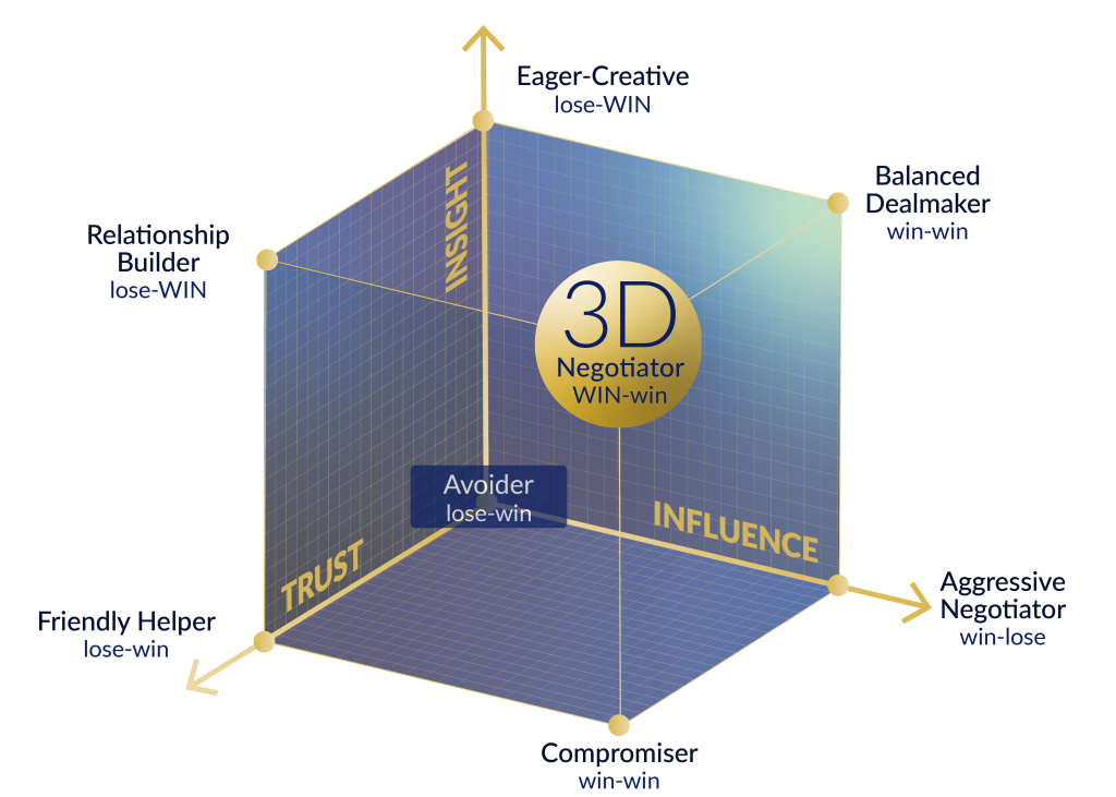 The 3D Negotiating Client Value program builds on the insight from the sales negotiating style self-assessment. It gives you practical skills to deal with different counterpart styles and to increase your own scores on Insight, Influence, and Trust, so you can negotiate more effectively.
